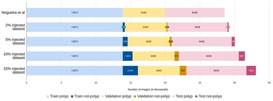 Starting from the images of each original partition, where each polyp only belongs to one single partition, we progressively added each percentage of images without polyps. The image injection was performed incrementally for each percentage, ensuring that the same not-polyp image was in the same partition type (training, validation, or test) and that the images found in the lower percentage datasets were part of the higher percentage datasets, creating supersets for each partition and dataset. For example, all the images in the 2% training are also included in the 5% dataset, along with an additional 3% of new not-polyp images. The number of resulting images for each partition is shown in the following, Figure 1.