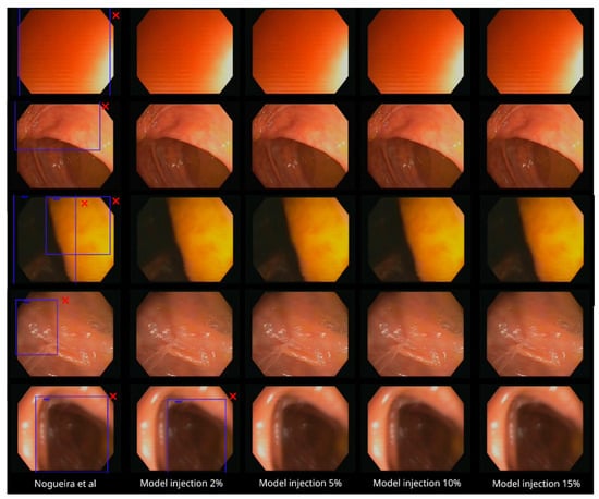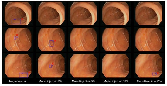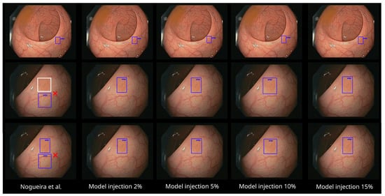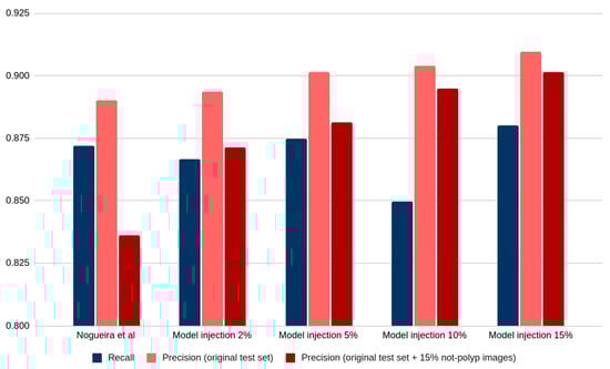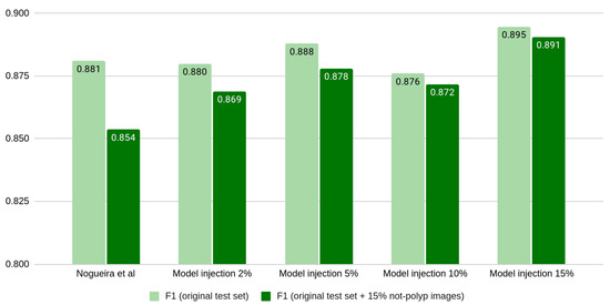 As a result, we have the original model (“Nogueira et al.”), plus four additional models (“Model injection p”, where p is the percentage of injection of not-polyp images into the dataset partitions used to develop the model).