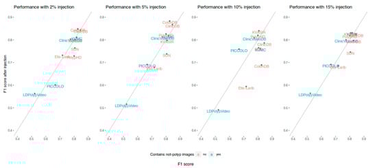 In order to visualize the performance changes among our four new models in each public dataset, Figure 5 compares the F1 performances obtained by our baseline model (X axis) and the F1 performances obtained by the four new models trained with not-polyp images (Y axis). The public datasets that contain not-polyp images are marked in light blue.