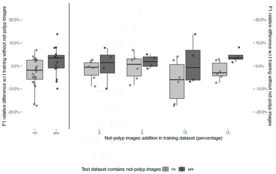 Relative F1 differences in the same test dataset with respect to our baseline model (trained without not-polyp images), and grouped test dataset type (i.e., containing or not containing not-polyp images).