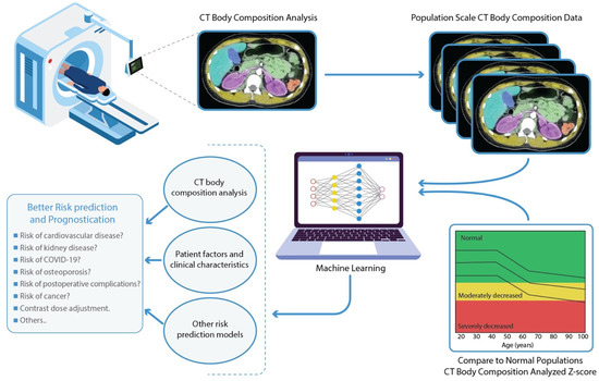 Population-scale machine learning-based CT body composition analysis for better risk prediction and prognostication. Body composition metrics can be extracted automatically from abdominal CT scans using machine learning-based segmentation approaches. Population scale CT body composition analysis can help establish age-, sex-, and race-specific Z-scores and reference curves for each metric. Patient-specific CT body composition metrics can be adjusted based on the reference curves prior to incorporation into risk prediction or prognostication models to aid in improved clinical decision-making.