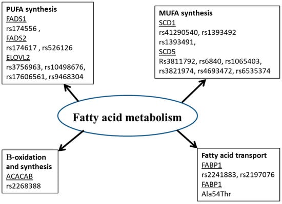 Polymorphisms of genes for proteins involved in fatty acid metabolism. ACACB: Acetyl-coenzyme A carboxylase, ELOVL: Elongase, FADS: Fatty Acid Desaturase, FABP: Fatty Acid Binding Protein, MUFA: monounsaturated fatty acids, PUFA: polyunsaturated fatty acids, SCD: stearoyl Co A desaturase.