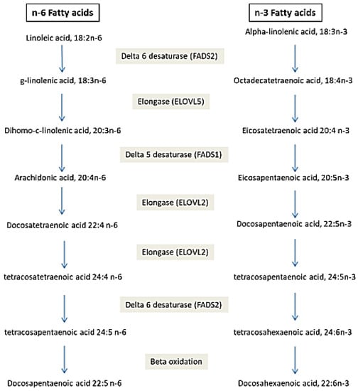 PUFA synthesis requires other enzymes. Deasaturase and elongase enzymes involved in fatty acid synthesis from ALA and LA are summarized in Figure 2. Two types of desaturases exist: delta-6-desaturase (FA desaturase 2, FADS2) and delta5-desaturase (FA desaturase 1, FADS1). FADS2 converts substrates ALA and LA, respectively at C18:4 n-3 and C18:3 n-6. This enzyme is also involved in a second step leading to the desaturation of the C24:5 n-3 and C24:4 n-6 substrates to C24:6 n-3 and C24:5 n-6, respectively. FADS1 desaturated the FA C20:4 n-3 and C20:3 n-6, respectively into EPA and AA. The activity of elongases (ELOVL) on eighteen- and twenty-carbon FA and n-3 long-chain PUFA is the result of ELOVL5 gene expression. On the other hand, ELOVL2 is the gene allowing the elongation of PUFAs with twenty and twenty-two carbon atoms. The genes coding for desaturases and elongases are the most studied to explore the genetic effect of FA on the development of diseases [79,102,103,104]. Hammouda et al. showed that rs174556 TT genotype of FADS1 is associated with a higher AA level and AA/DGLA (Dihomo-gamma-linolenic acid) index and increased risk of Alzheimer’s disease. Additionally, rs3756963 TT genotype of ELOVL2 is associated with increased AA and AA/DGLA index and increased risk of Alzheimer’s disease. However, rs174617 of FADS2 is not associated with either the fatty acid profile or Alzheimer’s disease. The combination of the two variants increases further the susceptibility to Alzheimer’s disease.