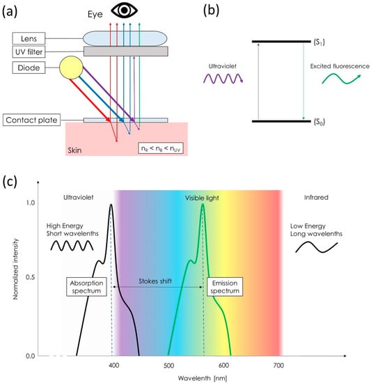Basics of multispectral and ultraviolet-induced fluorescence dermatoscopy: Each diode of a dermatoscope emits light characterized by particular energy and wavelength that impacts its refraction in the skin, its penetration, absorption by the chromophores, scattering, and reflection. Reflected light is recorded by the observer. (a) Reflected UV light is blocked by the UV filter that allows the passage of the visible spectrum of light. (b) UV-excited skin chromophore moves from the ground vibrational level (S0) to the higher vibrational level (S1). Moving back to the ground vibrational level is accompanied by the emission of new photon (usually of a longer wavelength, so belonging to the visible spectrum of light). (c) This photon is responsible for the UV-excited fluorescence (Stokes shift phenomenon) seen by the observer.