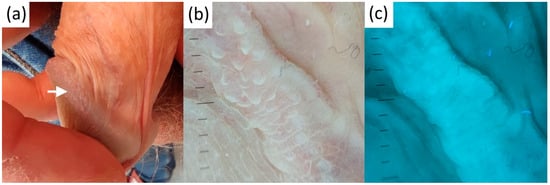 Clinical (a), contact-polarized (b), and ultraviolet-induced fluorescence (c) dermatoscopic images of genital lichen planus.