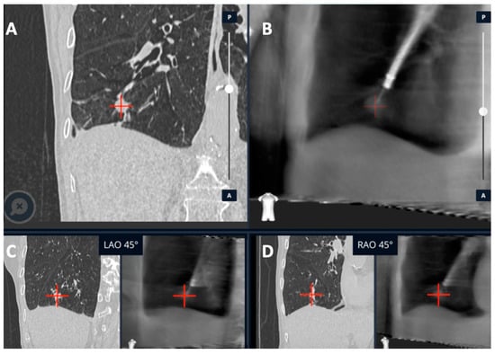 - Kalchiem-Dekel, O.; Fuentes, P.; Bott, M.J.; Beattie, J.A.; Lee, R.P.; Chawla, M.; Husta, B.C. Multiplanar 3D fluoroscopy redefines tool-lesion relationship during robotic-assisted bronchoscopy. Respirology 2021, 26, 120–123. [Google Scholar] [CrossRef] [PubMed]