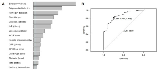 Random forest analysis. (A) Most important features based on random forest analysis (red line: absolute value of the lowest observed negative importance measure). (B) Receiver operating curve (ROC) and area under the curve (AUC) = 0.859. ACLF, acute-on-chronic liver failure; CRP, C-reactive protein; INR, international normalised ratio; MELD-Na, model for end-stage liver disease with serum sodium.