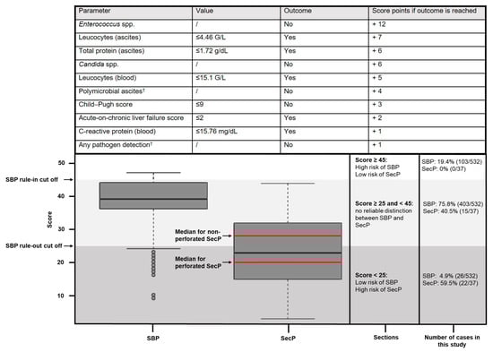 - Würstle, S.; Hapfelmeier, A.; Ka-rapetyan, S.; Studen, F.; Isaakidou, A.; Schneider, T.; Schmid, R.M.; von Delius, S.; Gundling, F.; Burgkart, R.; et al. Differentiation of Spontaneous Bacterial Peritonitis from Secondary Peritonitis in Patients with Liver Cirrhosis: Retrospective Multicentre Study. 2023. Available online: https://bookerar.shinyapps.io/Score_SecP/ (accessed on 14 January 2023).
