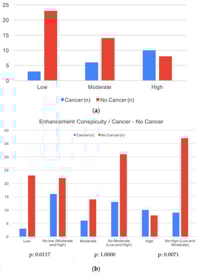 (a,b) Graphic representation of the contingency table related to the enhancement conspicuity and the risk of cancer [15].