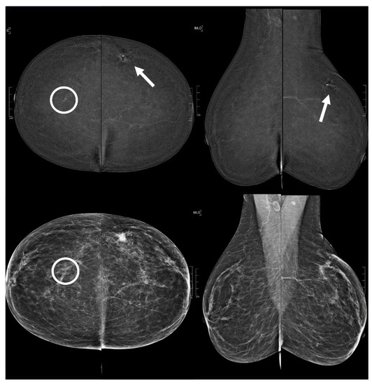 A 60 year old patient. Contrast-enhanced digital mammography performed as preoperative staging for a B5 lesion in the left breast (arrows). In the early RC in the right breast, there was an enhancing asymmetry in the central quadrants with high conspicuity only visible in CC (circle), corresponding to an architectural distortion in low-energy images. This architectural distortion subsequently underwent VABB (tomosynthesis-guided vacuum assisted breast biopsy), which confirmed a ductal in situ carcinoma.