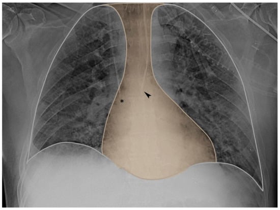 Chest X-ray mediastinum view. The tip of the central venous catheter (asterisk) and the tip of the esophageal balloon (arrow) are both closely located within the mediastinum (yellow area).