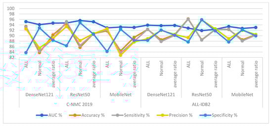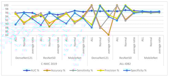 Based on the segmentation algorithm, the DenseNet121, ResNet50, and MobileNet models yielded good results for classifying the C-NMC 2019 and ALL-IDB2 acute leukemia datasets, as shown in Table 5 and Figure 8.