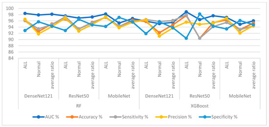 The XGBoost classifier with fusion features of ResNet50-MobileNet achieved an AUC of 97.85%, accuracy of 97.6%, sensitivity of 97.8%, precision of 97.15%, and specificity of 97.35%. In contrast, the XGBoost classifier with fusion features of DenseNet121-MobileNet achieved an AUC of 98.85%, accuracy of 98.1%, sensitivity of 97.8%, precision of 97.85%, and specificity of 97.95%. The XGBoost classifier with fusion features of DenseNet121-ResNet50-MobileNet achieved an AUC of 98.55%, accuracy of 98.2%, sensitivity of 98%, precision of 97.85%, and specificity of 98.15%.