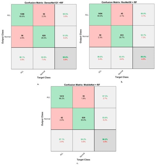 When evaluating dataset systems C-NMC 2019: The RF classifier with fusion CNN features produces a confusion matrix, as shown in Figure 15. First, DenseNet121-ResNet50-RF attained an accuracy of 98.9% and 95.3% for ALL and normal classes. Second, ResNet50-MobileNet-RF attained an accuracy of 98.1% and 95.7% for ALL and normal classes. Third, DenseNet121-MobileNet-RF attained an accuracy of 99.2% and 97.1% for ALL and normal classes. Fourth, DenseNet121-ResNet50-MobileNet-RF attained an accuracy of 99.3% and 97.6% for ALL and normal classes.