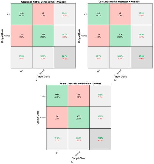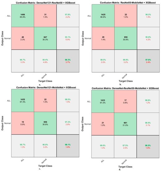 The XGBoost classifier with fusion CNN features produces a confusion matrix, as shown in Figure 16. First, DenseNet121-ResNet50-XGBoost achieved an accuracy of 96.7% and 95.4% for ALL and normal classes. Second, ResNet50-MobileNet-XGBoost achieved an accuracy of 98% and 96.8 for ALL and normal classes. Third, DenseNet121-MobileNet-XGBoost achieved an accuracy of 98.7% and 96.8% for ALL and normal classes. Fourth, DenseNet121-ResNet50-MobileNet-XGBoost achieved an accuracy of 98.6% and 97.5% for ALL and normal classes.