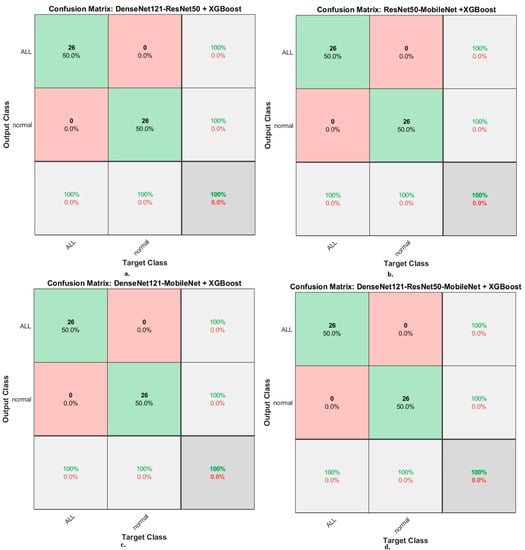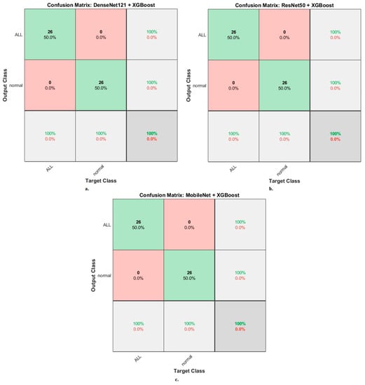 The XGBoost classifier with fusion CNN features produces a confusion matrix, as shown in Figure 18. First, DenseNet121-ResNet50-XGBoost achieved an accuracy of 100% and 100% for ALL and normal classes. Second, ResNet50-MobileNet-XGBoost achieved an accuracy of 100% and 100% for ALL and normal classes. Third, DenseNet121-MobileNet-XGBoost achieved an accuracy of 100% and 100% for ALL and normal classes. Fourth, DenseNet121-ResNet50-MobileNet-XGBoost achieved an accuracy of 100% and 100% for ALL and normal classes.