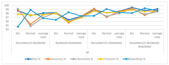- Fusion of deep feature maps of CNN models to obtain hybrid deep feature map vectors for DenseNet121-ResNet50, ResNet50-MobileNet, DenseNet121-MobileNet, and DenseNet121-ResNet50-MobileNet models and their classification by RF and XGBoost classifiers.