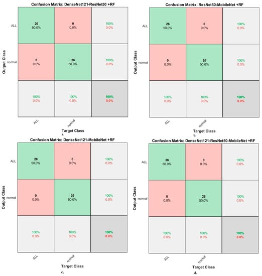 Results of the RF classifier based on fusion features of the CNN models of the ALL-IDB2 dataset for the diagnosis of acute leukemia, confusion matrix of (a) DenseNet121-ResNet50, (b) ResNet50-MobileNet, (c) DenseNet121-MobileNet, and (d) DenseNet121-ResNet50-MobileNet.