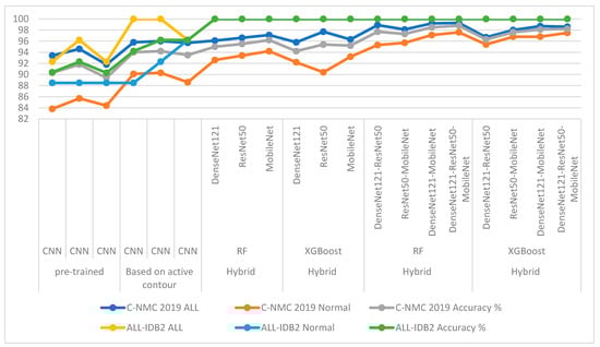 Table 8 and Figure 19 summarize the results of the proposed systems for analyzing microscopic blood images of the two C-NMC 2019 and ALL-IDB2 acute leukemia datasets. The table shows each system’s overall accuracy and each class’s accuracy for each system. It is noted that the pre-trained CNN models did not produce promising results for the detection of acute leukemia. While the results improved when the images were optimized, the region of interest (WBC) was segmented and then fed to the CNN models for classification. The pre-trained CNN models on the ImageNet dataset do not achieve superior results because the ImageNet dataset on which the models are trained lacks medical images. Therefore, hybrid systems CNN-RF and CNN-XGBoost were applied, where it was noticed that the results improved and the systems achieved superior results for diagnosing the two leukemia datasets. It is noted that the accuracy is better improved when the CNN features are serially combined and classified with RF and XGBoost classifiers.