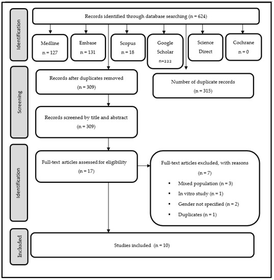 In the first phase of the selection, 624 references were identified, of which 315 were duplicates, leaving 309 unique references for the screening phase. The full texts of seventeen potential articles were retrieved for review. However, seven of these articles were excluded for not meeting the determined inclusion criteria. The remaining ten studies met the criteria for inclusion in this systematic review for final analysis (Figure 1).