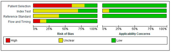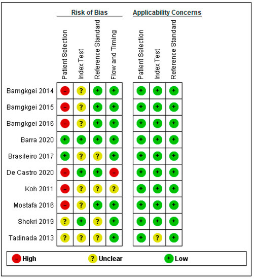 Summary of risk of bias and applicability concerns [4,7,8,9,20,21,22,23,24,25].