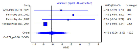 In all three studies and four cohorts, the serum value of Vit D was found to be lower in patients with tinnitus than in those without, with WMDs ranging between −1.45 to −7.57 ng/mL. The pooled analysis performed using the quality effects models confirmed a significantly negative WMD of Vit D concentration in patients with tinnitus compared to those without, with a WMD of −6.2 ng/mL (95% CI, −10.3 to −2.1 ng/mL; I2, 56%), though such difference was largely determined by the study of Nowaczewska et al. [18], expressing the largest sample size (n = 300) (Figure 1).