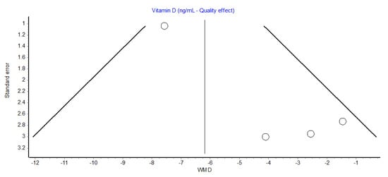 Overall, the serum Vit D concentration was hence found to be 22% lower in patients with tinnitus compared to those without. A slightly lower but still significant difference was also found using the random effects model (WMD, −4.6 ng/mL; 95% CI, −8.0 to −1.21 ng/mL). The funnel plot, as shown in Figure 2, did not reveal a substantial publication bias.