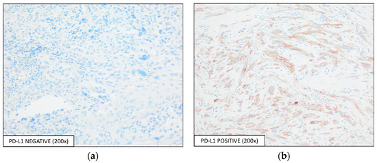 Detection of PD-L1 expression by IHC using the E1L3N antibody, with an optical magnification of 200×. Representative images of PD-L1-(a) negative and -(b) positive expressions are shown.