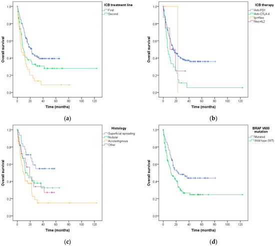 Association of (a) systemic ICB treatment line, (b) type of ICB, (c) histological melanoma subtype, (d) BRAF V600 mutation status, and (e) PD-L1 expression with overall survival after the ICB treatment in advanced melanoma patients.