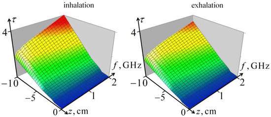 Figure 2 shows the optical thickness of the probing signal (integral of the absorption coefficient) in a five-layered living tissue (skin, fat, muscle, ribs, and lungs) for the inhalation and exhalation phases in the signal frequency band. It can be seen that the frequency-depth distribution of the attenuation of the probing field in the lungs is sensitive to the air content in the lungs, at least up to penetration depths of about 10 cm, which provides the informativity of the proposed method.