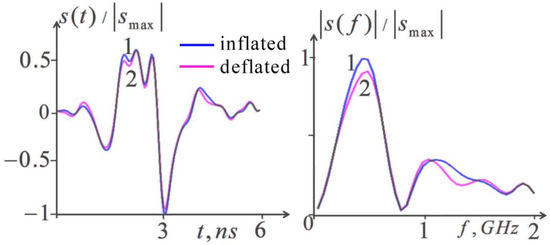 As seen in Figure 3, the differences between the pulse shapes calculated for inflated and deflated lungs are rather small, while the corresponding differences in the spectra are more pronounced. Our simulation showed the approximate frequencies at which the spectral contribution of the modeled inhomogeneities disappeared. It turns out that the spectrum of random errors is predominantly located at higher frequencies, which makes it possible to limit the spectral bandwidth of the analysis, eliminating the influence of the corresponding components of these errors. As seen in Figure 3, the informative part of their spectra lies at f < 1.5 GHz. The possible effect of the experimental random is investigated by calculating the spectrum of the scattered signal with added random errors at an rms value of 1% (relative to the pulse amplitude) that corresponds to the estimated error level of the measurement noise. It was obtained that the spectral errors increased at frequencies f > 1 GHz; thus, the informative band appeared even narrower. The bandwidth of 0.05–0.9 GHz was found and used to be optimal in the further processing. To suppress the noise effect during further processing by the pulse signal, it was proposed to recalculate it using the inverse Fourier transform by the informative part of its frequency spectrum and to use the resulting modified pulse in solving the corresponding inverse problems (4), (10)–(12).