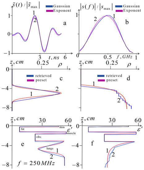 In this simulation, a preset structure of the cover tissues was used with the inflated lungs (with full inhalation). The same structure was used to calculate the signal parameters in Figure 3. The retrieved structure of the cover tissues was retrieved from the solution of the inverse problem using algorithm (4) from the informative part of the spectrum of the simulated modified signal. In Figure 4e,f, the retrieved and preset real parts of the thorax permittivity profiles are shown for the frequency f = 250 MHz. In these profiles, the cover structure obtained from (4) was combined with lung permittivity for the Gaussian and exponential profiles (lines 2 in Figure 4c,d) retrieved from the solution of the inverse problems (10)–(12).