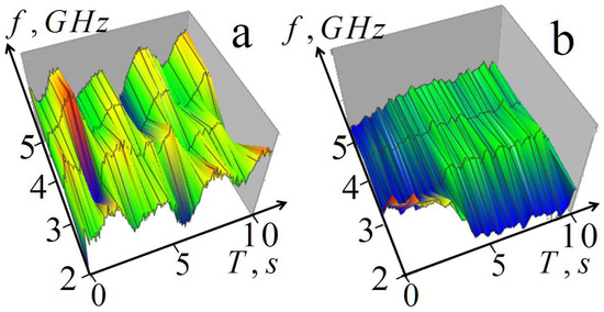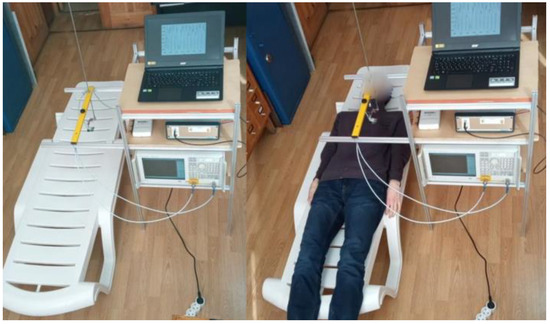 In our experiments, we used the equipment that includes processing, a transceiver system with two identical bow-tie antennas with the length of arms 3.8 cm and the width of 5.4 cm that were used in [28,29,30,33], an oscilloscope GZ10E, broadband (0.05–5 GHz) pulse generators GZ1120ME-01,03 with the pulse time 50 ns at 1024 sweep points (a resolution of about 0.05 ns) and a repetition time of 10 μs, and the control computer for recording signals. The pickup time added up to 10 s (500 pulses). The safety of these measurements in the band of cellular communications was confirmed by the conclusion of the Ethics Committee that was based on estimations based on data of measurements on biological tissues, defining that the upper limit of the mobile phone radiation determined in Europe by the SAR parameter (Specific Adsorption Rate) as 2 W/kg (calculated for 10 g of tissues) more than an order of magnitude exceeds the SAR value estimated for our system radiation.