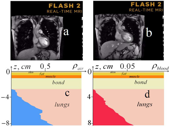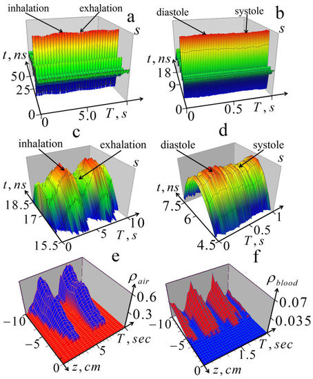 Variations in the scattered signal associated with breathing and cardiac activity are rather small and cannot be seen everywhere on the surface of the chest—especially variations associated with the heartbeat, which are most often recorded in the full inhalation phase, since the blood wave fades in lung capillaries in the exhalation phase. Periodic processes associated with breathing and cardiac activity have different periods; moreover, breathing can be controlled. Therefore, it is possible to isolate the contributions of air and blood to the variations in the permittivity and solve the corresponding inverse problems separately using the cover structure , previously obtained from (4).