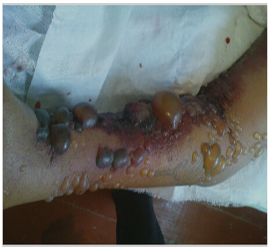 Typical appearance of a severe form of cutaneous anthrax lesions on the arm. Extensive erythema and oedema as well as hemorrhagic bullae can be seen (Image supplied by Professor Ainura Kutmanova and Dr. Saparbai Zholdoshev).