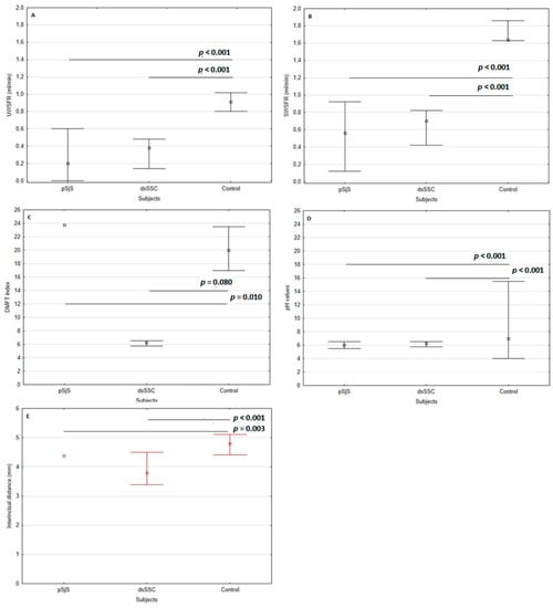 Comparison of variables in pSS and dcSSc patients: (A) UWSFR, (B) SWSFR, (C) DMFT index, (D) pH values of saliva, (E) interincisal distance (mm). Abbreviations: pSS, primary Sjögren’s Syndrome; dcSSc, diffuse cutaneous systemic sclerosis; UWSFR, unstimulated whole salivary flow rate; SWSFR, stimulated whole salivary flow rate; DMFT, D—decayed, M—missing, F—filled tooth.