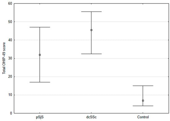 OHIP-49 scores in pSS and dcSSc patients, and control subjects.