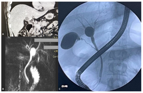 (A) CT scan, coronal section—type II CC; (B) MRCP reconstruction—type II CC; (C) ERCP—fusiform dilatation of the biliary confluence.