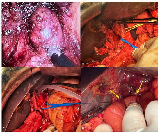 With the presumptive diagnosis of type II CC in mind, laparoscopic diverticulectomy was planned. During laparoscopy, the cystic dilation was found to be located at the confluence of the hepatic ducts and origin of the CBD, a highly unusual occurrence not included in Todani’s classification; the cyst had an evident extrahepatic localization, with both hepatic ducts and distal CBD duct having normal calibers and a long cystic duct joined the CBP well below the dilatation, in an apparently normal section (Figure 3A–C). Conversion to open surgery was deemed necessary to achieve complete resection of the cyst and the proximal segment of the common bile duct. Reconstruction was carried out by Roux-en-Y double-tutorized hepaticojejunostomy (Figure 3D). The patient’s postoperative course was uneventful. Blood tests and repeated abdominal ultrasound scans were all normal by the 5th postoperative day, and the patient was discharged 2 days later.