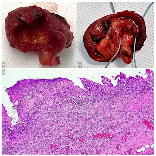 The resection specimen is demonstrated in Figure 4A,B—fusiform CBD dilatation with thick but even walls that received both the right and left hepatic ducts—as it appears, a cystic dilatation of the biliary confluence. The pathology report described chronic gallbladder inflammation; the cystic wall was formed by biliary columnar epithelium with focal ulcerations and marked transmural polymorphic inflammatory infiltration. (Figure 4C). The CBP lesion was considered compatible with congenital dilatation of the common bile duct.