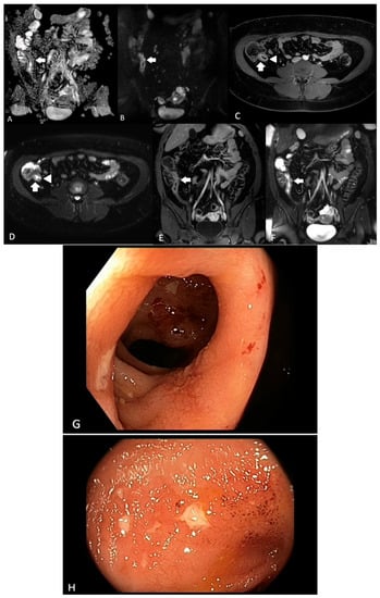 - Koilakou, S.; Sailer, J.; Peloschek, P.; Ferlitsch, A.; Vogelsang, H.; Miehsler, W.; Fletcher, J.; Turetschek, K.; Schima, W.; Reinisch, W. Endoscopy and MR enteroclysis: Equivalent tools in predicting clinical recurrence in patients with Crohn’s disease after ileocolic resection. Inflamm. Bowel Dis. 2010, 16, 198–203. [Google Scholar] [CrossRef]