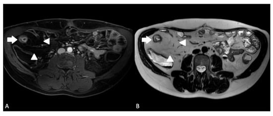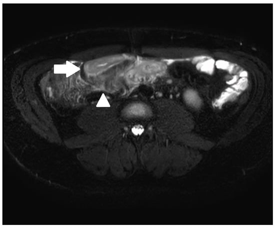 T2 mural signal intensity, also known as intramural oedema, is a finding unique to MRE and is not seen with other forms of cross-sectional imaging such as CTE. It is demonstrated by a high signal intensity within the submucosa of bowel wall in affected segments and is best appreciated on T2-weighted fat-suppressed images (see Figure 1 and Figure 3) []. Fat suppression allows for differentiation with chronic fibrotic CD, which also presents with a high signal on submucosal T2-weighted images []. Intramural oedema is known to correlate with degrees of active inflammation in CD seen via endoscopic assessment and on histology of surgical resection specimens [,]. In the absence of endoscopically active CD, oedema is seldom present [,]. In a study of 50 patients undergoing paired MRE and colonoscopy, intramural oedema was present in only 5/198 (2.5%) of endoscopically normal bowel segments []. Studies have demonstrated that mural signal intensity is able to differentiate grades of endoscopic disease when small bowel ulceration is present; however, it is less sensitive in non-ulcerative, endoscopically active CD [,]. In active, ulcerative CD, its prevalence is significantly higher, with studies reporting a sensitivity ranging between 68–84% [,,]. Moreover, intramural oedema demonstrates good reliability, with one study demonstrating an inter-class correlation of 0.80 (95% CI, (0.69–0.89)) within the terminal ileum, with lower reliability in colonic segments [].