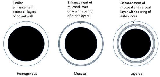 - Bellini, D.; Rivosecchi, F.; Panvini, N.; Rengo, M.; Caruso, D.; Carbone, I.; Ferrari, R.; Paolantonio, P.; Laghi, A. Layered enhancement at magnetic resonance enterography in inflammatory bowel disease: A meta-analysis. World J. Gastroenterol. 2019, 25, 4555–4566. [Google Scholar] [CrossRef] [PubMed]