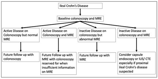 Moreover, in a recent meta-analysis, the pooled sensitivity and specificity of MRE for the detection of endoscopic recurrence (Rutgeerts > i1) was 97% (95% CI, (89–100%)) and 84% (61–96%), respectively []. MRE showed an excellent discrimination capacity between active and inactive endoscopic disease, with an AUC of 0.98 []. Despite these impressive results, only three studies with a total of 76 patients were included in the meta-analysis, thereby limiting the applicability of these data, particularly in mild post-operative CD recurrence (Rutgeerts i1-2). More recently, a large study of 216 CD patients with post-ileocaecal resection who underwent tandem ileocolonoscopy and cross-sectional imaging (MRE or CTE) found BWT, luminal narrowing, mural hyper-enhancement, and length of the disease on imaging to be significantly associated with endoscopic recurrence (each p < 0.05) []. Critically, when defining endoscopic recurrence as Rutgeerts ≥ i2a, using cross-sectional imaging to differentiate active endoscopic disease demonstrated a high sensitivity of 89%, yet a low specificity of merely 32%, thus limiting its role to screening for disease recurrence with confirmation required through ileocolonoscopic examination [].