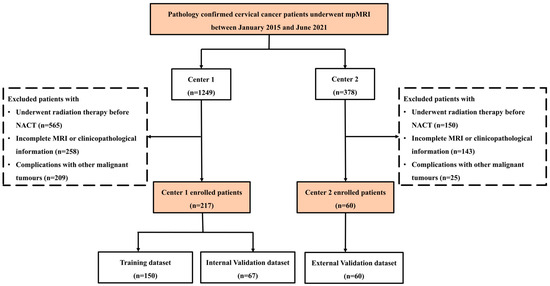 A retrospective study was performed after receiving approval from the Ethics Committee of our institution, who waived the need for informed consent from the participants. The study was conducted in accordance with the Declaration of Helsinki. All procedures performed during this study complied with the 1964 Helsinki declaration. The data of patients with cervical cancer with a confirmed histopathology from two centers between January 2015 and June 2021 were enrolled (Figure 1 and Supplementary S1). The inclusion criteria were as follows: (1) conventional pelvic MR scanning examinations performed before NACT, including T2-weighted imaging (T2WI), diffusion-weighted imaging (DWI) and contrast-enhanced (CE)-T1WI, in patients with pathologically confirmed cervical cancer; (2) FIGO stage (2018) from IB to IIIB; (3) use of the same NACT therapy; and (4) the presence of clinicopathological data. The exclusion criteria were as follows: (1) radiation therapy before NACT; (2) incomplete MR sequence or clinicopathological information; and (3) complications with other malignant tumors. Ultimately, a total of 220 patients from center 1 and 65 patients from center 2 were enrolled according to the selection criteria. The overall radiomics pipeline of this study is shown in Figure 2.
