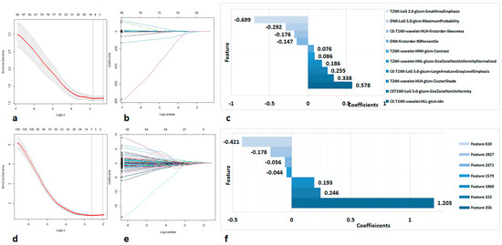 The lasso plots for radiomics feature selection: (a,b) for handcrafted radiomics features; (c) 10 features and corresponding coefficients; (d,e) for DL-based radiomics features; (f) 7 features and corresponding coefficients.