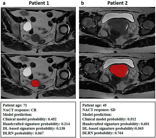 Two typical cases with MR images, clinical characteristics, and predicted results of response to NACT by different models. The red area represented the tumor issue. A 71-year-old woman (a) with complete response (CR). The probability of chemoresistance predicted by clinical model, handcrafted radiomics signature and DL-based signature was 0.452, 0.214 and 0.138, and that of chemoresistance predicted by the DLRN was 0.067. A 45-year-old woman (b) with stable disease (SD). The probability of chemoresistance predicted by clinical model, handcrafted radiomics signature and DL-based signature was 0.512, 0.601 and 0.5133, and that of chemoresistance predicted by the DLRN was 0.764. T2WI = T2-weighted imaging; DWI = diffusion-weighted imaging; CE-T1WI = contrast-enhanced-T1 weighted imaging.