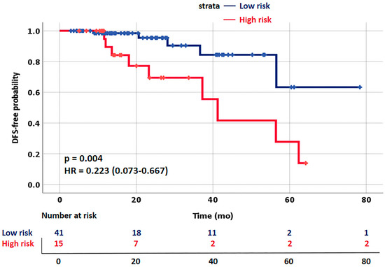 Furthermore, we looked into the prognosis of DLRN in 101 patients with LACC. The median duration of the follow-up was 29 (range, 16–40) months. As shown in Figure 8, higher DLRN scores were demonstrated to be substantially related to improved DFS (hazard ratio (HR), 0.223; 95% CI, 0.073–0.667, log-rank test, p = 0.004).