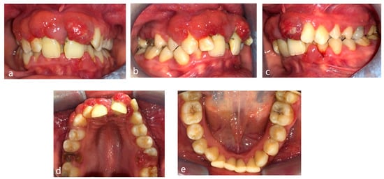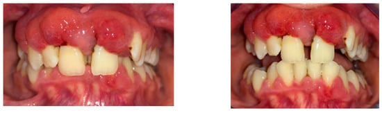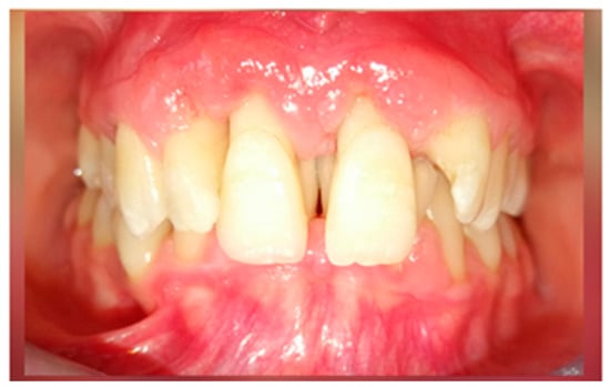 A 15-year-old female teenager was referred by a general practitioner to the Department of Periodontology, Faculty of Dental Medicine, University of Medicine and Pharmacy Carol Davila, Bucharest, Romania. There were no other diseases, such as diabetes or other hematological disease, no smoking, and no medications being taken by the patient. She had an accident (falling down the stairs) when she was 7 years old but did not experience any general or dental trauma (without notable objective or subjective clinical signs) as a result. Consequently, she did not visit a dentist for any treatment. The reasons for the first visit were teeth mobility, which appeared 2 years behind, poor aesthetic aspect of gingiva, and poor masticatory performance. The following clinical parameters were assessed at baseline: bleeding upon probing (BOP), plaque index score (O’Leary et al.) [12] and probing depth (PD). All measurements were performed by the same examiner using a periodontal probe (North Carolina 15 mm probe) on six sites for each tooth. The initial examination revealed deep probing pocket depth, severe gingival overgrowth, bleeding upon probing, and gum recession. Gingival inflammation was observed. Periodontal abscesses were registered to both maxillary central incisors (Figure 1). Suppuration and tooth mobility were registered to both maxillary central and lateral incisors. Gingival overgrowth was registered mainly on the maxillary anterior tooth side.