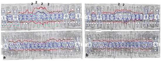Periodontal chart before treatment (a) and after treatment (b) (Department of Periodontology, Carol Davila University of Medicine and Pharmacy). Red line—probing depth (PD), blue line—gingival margin, crossed tooth—excluded tooth, class 2—tooth mobility (Miller Classification).